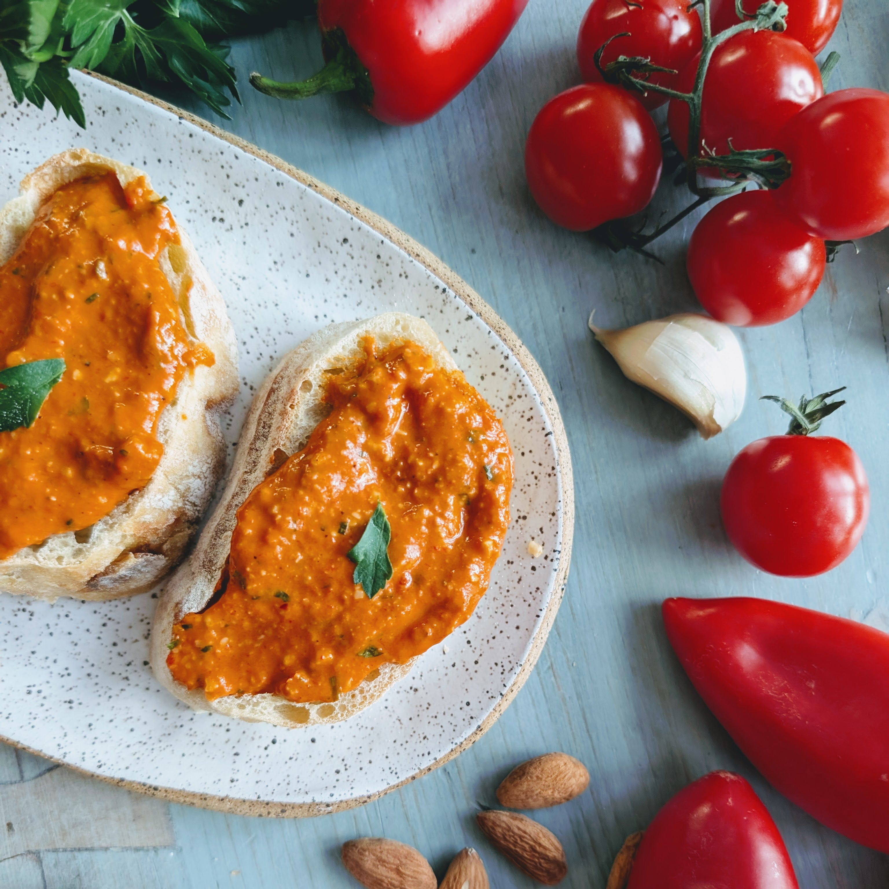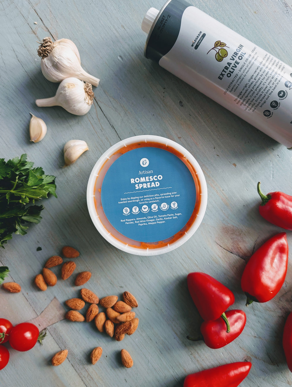 Ingredients: Red Peppers, Almonds, Olive Oil, Tomato Paste, Sugar, Parsley, Red Wine Vinegar, Garlic, Kosher Salt, Paprika, Aleppo Pepper.